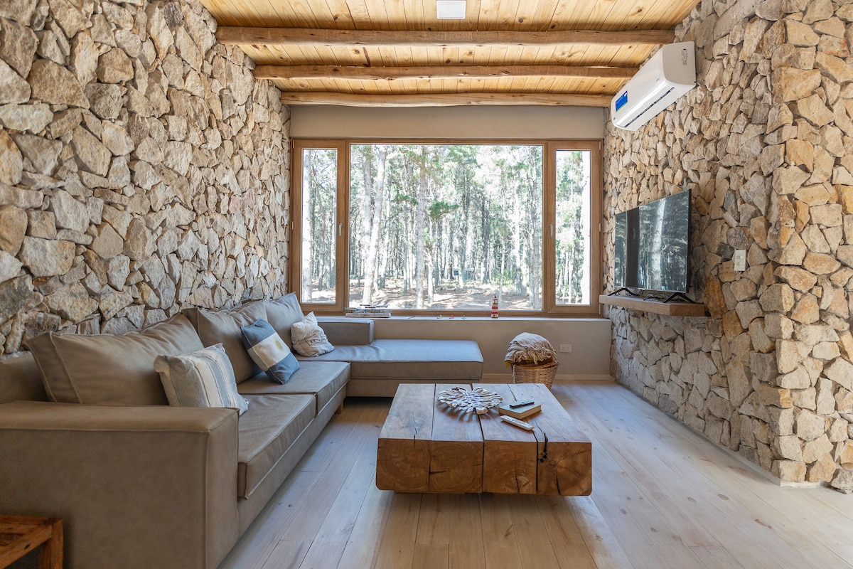 La edificación presenta un estilo moderno combinando piedras, maderas y mampostería. Grandes ventanales dejan entrar la luz durante todo el día y posibilita conectarse mejor con el entorno natural y una hermosa vista de la cordillera . El terreno en desnivel, plantas y árboles nativos y un atractivo arroyo natural, repartido en media hectárea, completan una composición que permiten tener momentos de plena tranquilidad. La casa cuenta con grupo electrógeno, alarma y calefacción por loza radiante.
