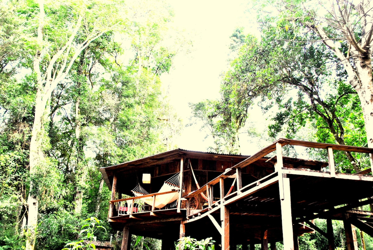 Casa en los árboles en medio De 60 hectáreas de selva tropical misionera frente al río.Ubicada en la selva misionera al norte de Argentina y a 20 km. De los Saltos del Mocon. La encantadora casa de madera está echa con materiales de mi propio lugar con una gran vista y senderos para recorrer parte de las 60 hectáreas . Tenemos 760 metros De Arroyo para recorrer pescar bañarse.Está estratégicamente ubicada por su privacidad. También hay cascada