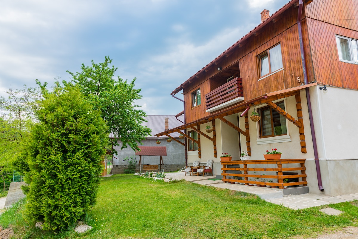 Our house is located in Transylvania, near Bran Castle. Originally, it belonged to my grandparents, my parents renovated it ten years ago and is now my family’s house and guest house. Our guest house is located on a quiet mountain landscape area, but near to the most important tourist attractions: Bran Castle (5 km), Rasnov Fortress (20 km), Bear Sanctuary (18 km), City of Brasov (35 km) and Carpathian Mountains (Natural Park Bucegi Mountains and National Park Piatra Craiului Mountains).