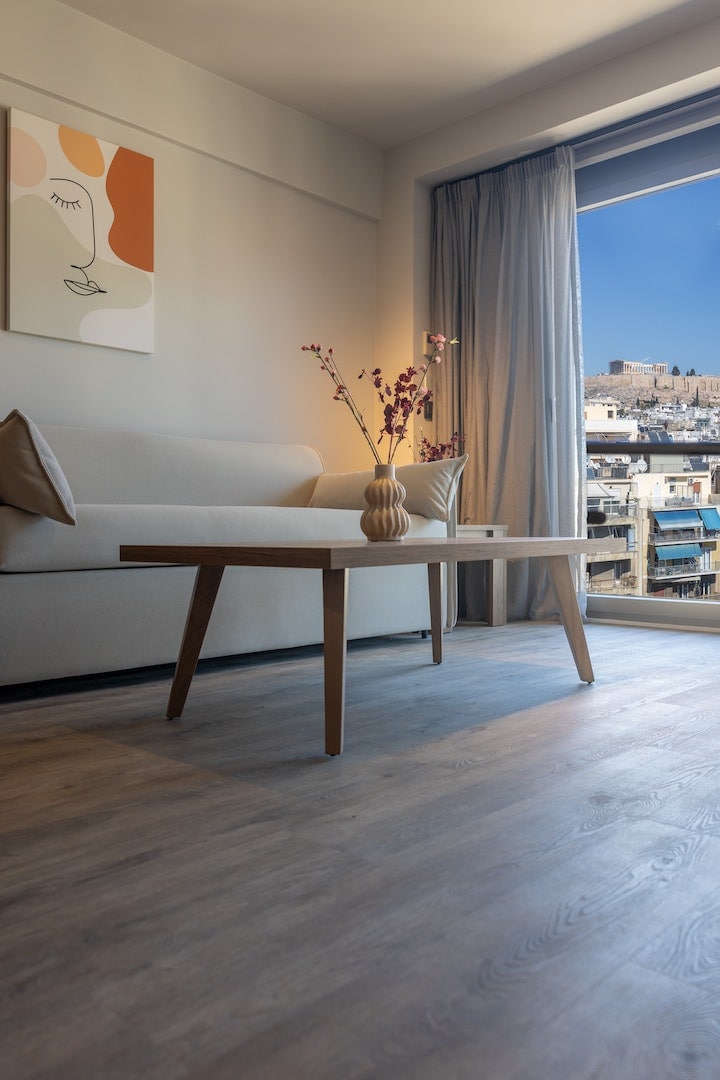 Modern Acropolis Suite on the last 5th floor with a breathtaking views. Air-conditioned ,elegantly furnished unit with a flat screen LCD TV, kitchenette with a microwave,fridge,kettle,tea/coffee making facilities, safetybox, hairdryer and the finest pure white linen and towels. Welcome coffee capsules and water battles. No stove in the Kitchen ! Spacious terrace that is overloking the Acropolis and the mountain Lykabetus.