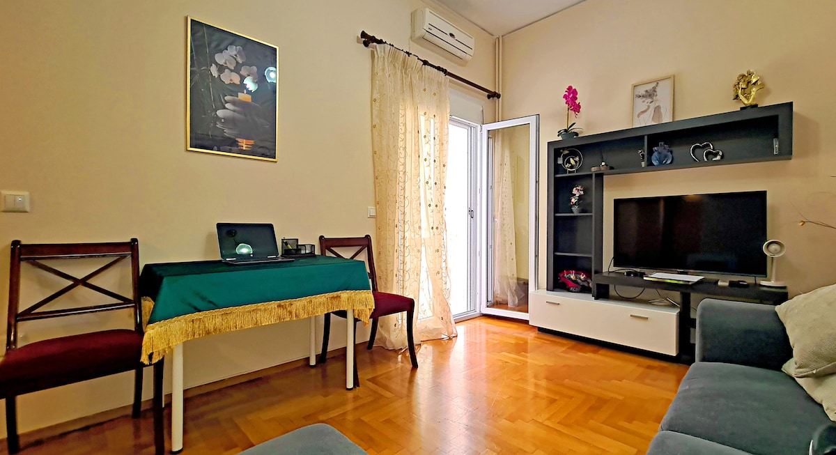 A fully equipped 1 bedroom apartment, one stop from Piraeus and 3 min walk to the train station of Neo Faliro. It has perfect location so as to explore Athens Riviera. Its classic but luxury furniture and equipment will fulfil the daily needs of every guest. It’s within walking distance to Metropolitan Hospital and the Stavros Niarchos Foundation Cultural Centre. From the balcony you can enjoy a peaceful breakfast, coffee or your drink overlooking the trees.