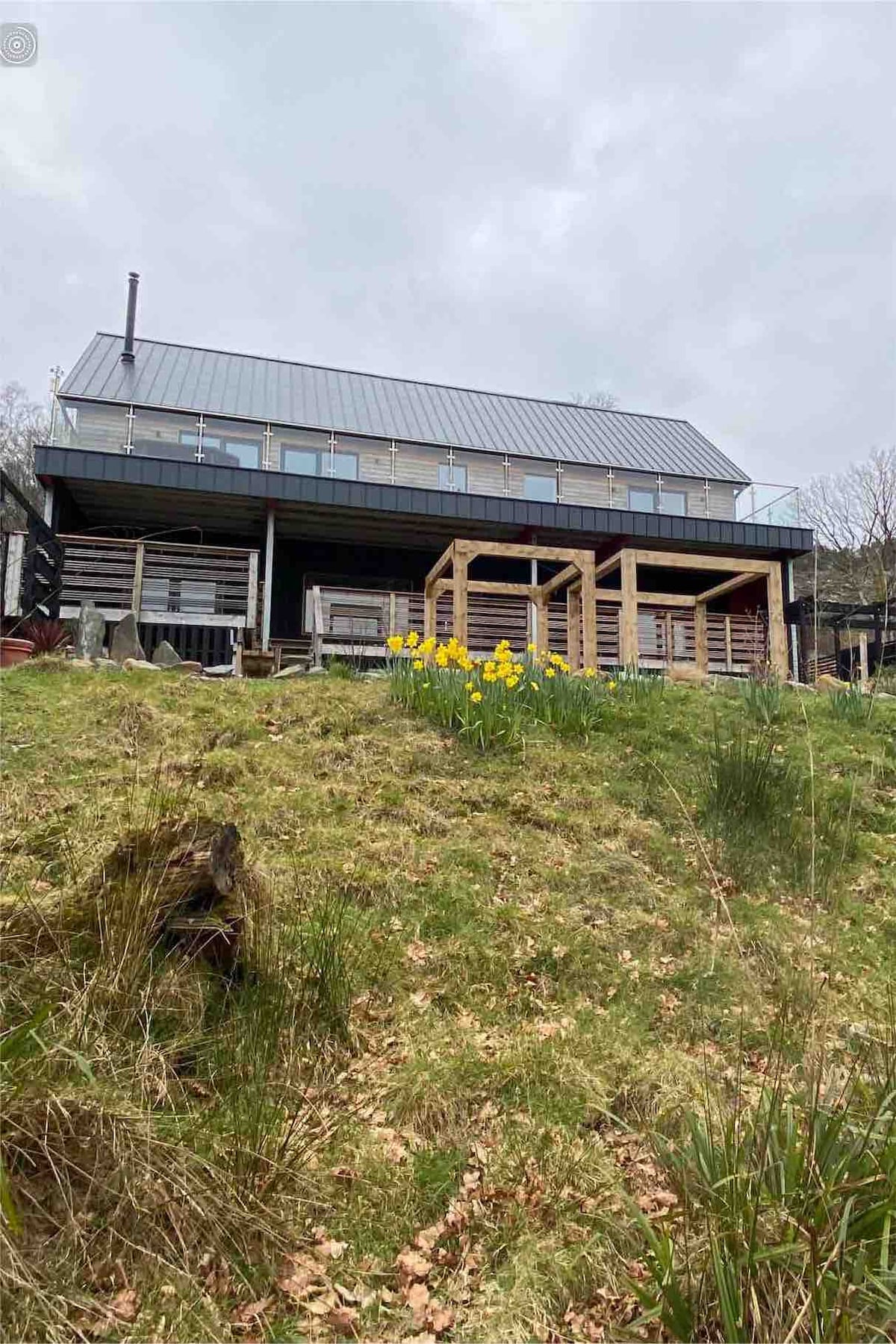 A contemporary house, designed and built by Philip, a true retreat, spectacular views. Stylish furnishings and calming interiors, it's the perfect place for a relaxing stay. A spacious apartment, en-suite bedroom and private lounge filled with interesting original art, floor-to-ceiling windows framing unforgettable views over the Clyde estuary permanently busy with marine traffic There's even a spacious wooden deck, bbq and fire pit Close to Loch Lomond N P, Argyle, Dunoon & west coast Scotland