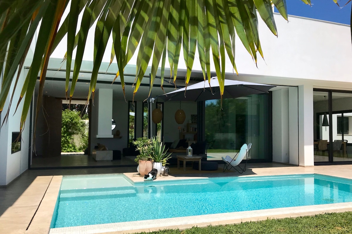 Rez de chaussée autonome avec 3 terrasses, grand jardin, Hammam, piscine privé. Vous adorerez le décor en bois style balinais. Un 150 m² éclairé par des grandes bais vitrées, avec un grand salon, 2 chambres à coucher dotée chacune de sa propre salle de bain, cheminée électrique, cuisine richement équipée, et espace bureau. Services inclus : - Café, sucre, eau à l'arrivée - Linge, draps, shampooing Services optionnels : - Navette Aéroport - Petit-déjeuner, cuisine TN - Hammam 30 euros