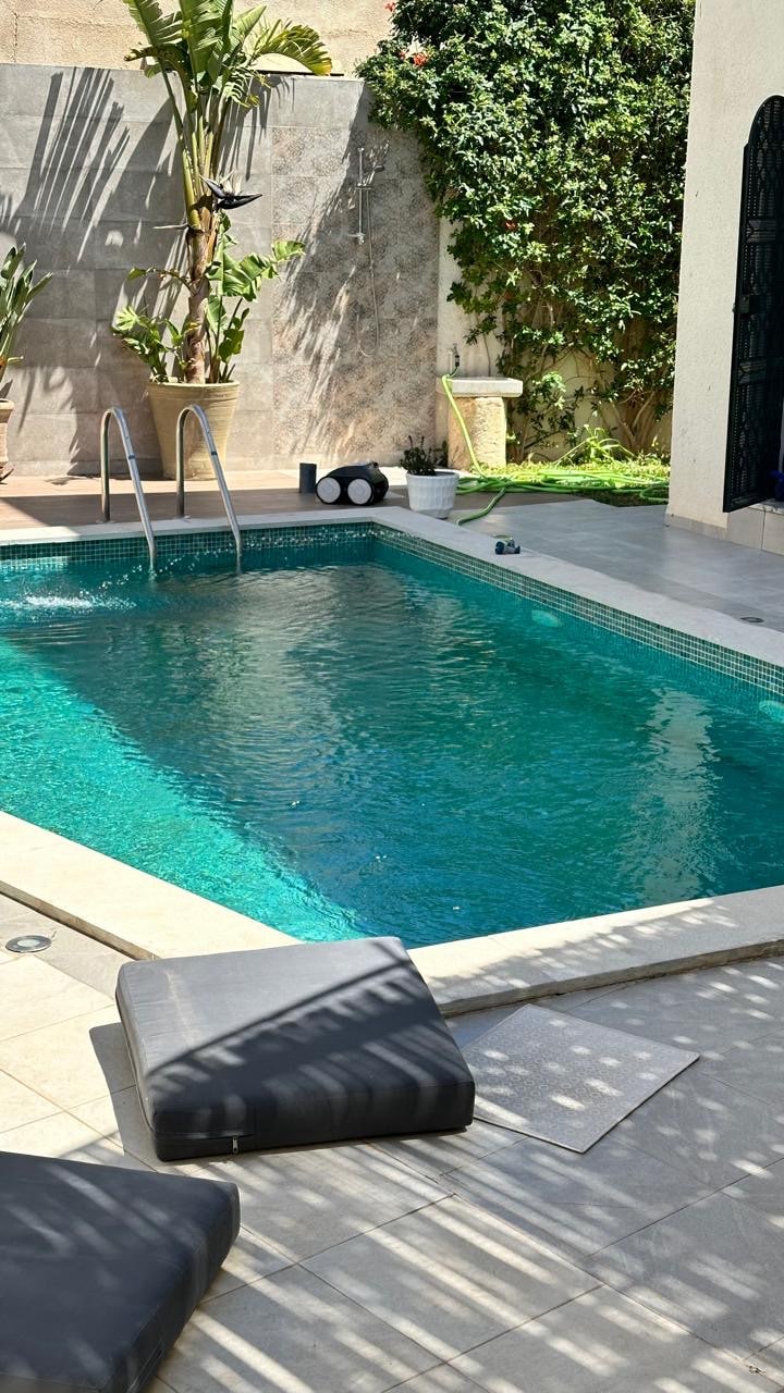 la résidence est composée d'un RDC ( occupé par ma femme et moi-même ) et deux appartements distincts et indépendants pour la location à l'étage. la résidence est située dans une cité ( ENNASR 2) résidentielle et calme, à dix minutes de l'aéroport et à 20 minutes du centre ville. toutes les commodités sont à proximité ( super marchés , cafés , restaurants...) l'espace terrasse-piscine est privé ( réservé uniquement au résidents )
