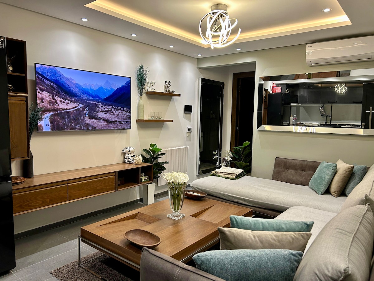 *ONE bedroom 🛌 with king size bed , work space laptop friendly and a dressing * ONE bathroom 🛁 with bath tray, candles, liquid soap, toilet roll and fresh towels * Fully equipped kitchen with breakfast essentials 🍳 , home made Tunisian 🇹🇳 spices to make delicious food 🥘 * Kitchen is opening in a spacious living room with L shape sofa where tou can enjoy watching your favorite movies 🎥 * A big balcony where you can enjoy an afternoon tea 🍵 with a view ( washing machine 🧺 is in the cornes)
