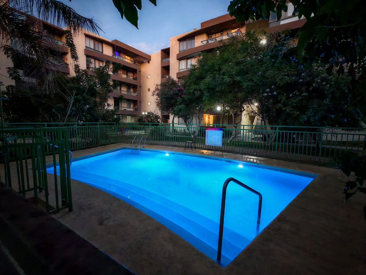 Departamento en 4to piso, 3 dormitorios, 1 baño, tvbox (canales en vivo, películas, series) e Internet, cocina, lavadora, balcones con mallas de seguridad para disfrutar de una hermosa vista a la piscina y sus áreas verdes, transporte público a pasos del lugar, portería y cámaras de vigilancia las 24 hrs., quincho, espacios abiertos, juegos infantiles, a metros de la playa, estacionamiento propio. Relájate con toda la familia en este alojamiento donde la tranquilidad se respira.