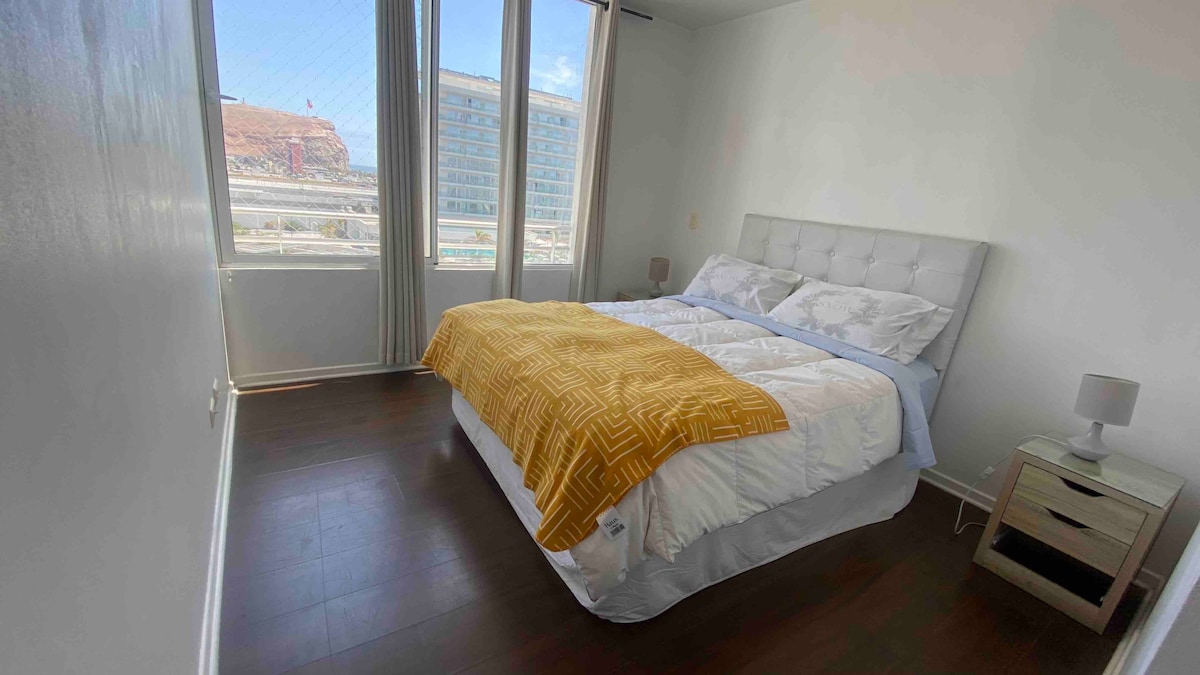 Apartamento en una excelente ubicación, muy seguro y confortable. Tienes de todo para hacer de tu estancia placentera. La ubicación es de fácil acceso pues está al costado en una de las avenidas como la panamericana norte y al otro costado la avenida costanera, Cercano a centros comerciales y playas como Las Machas y Chinchorro. SANITIZADO Y VENTILADO DOS DÍAS DESPUÉS DEL ÚLTIMO HUÉSPED.