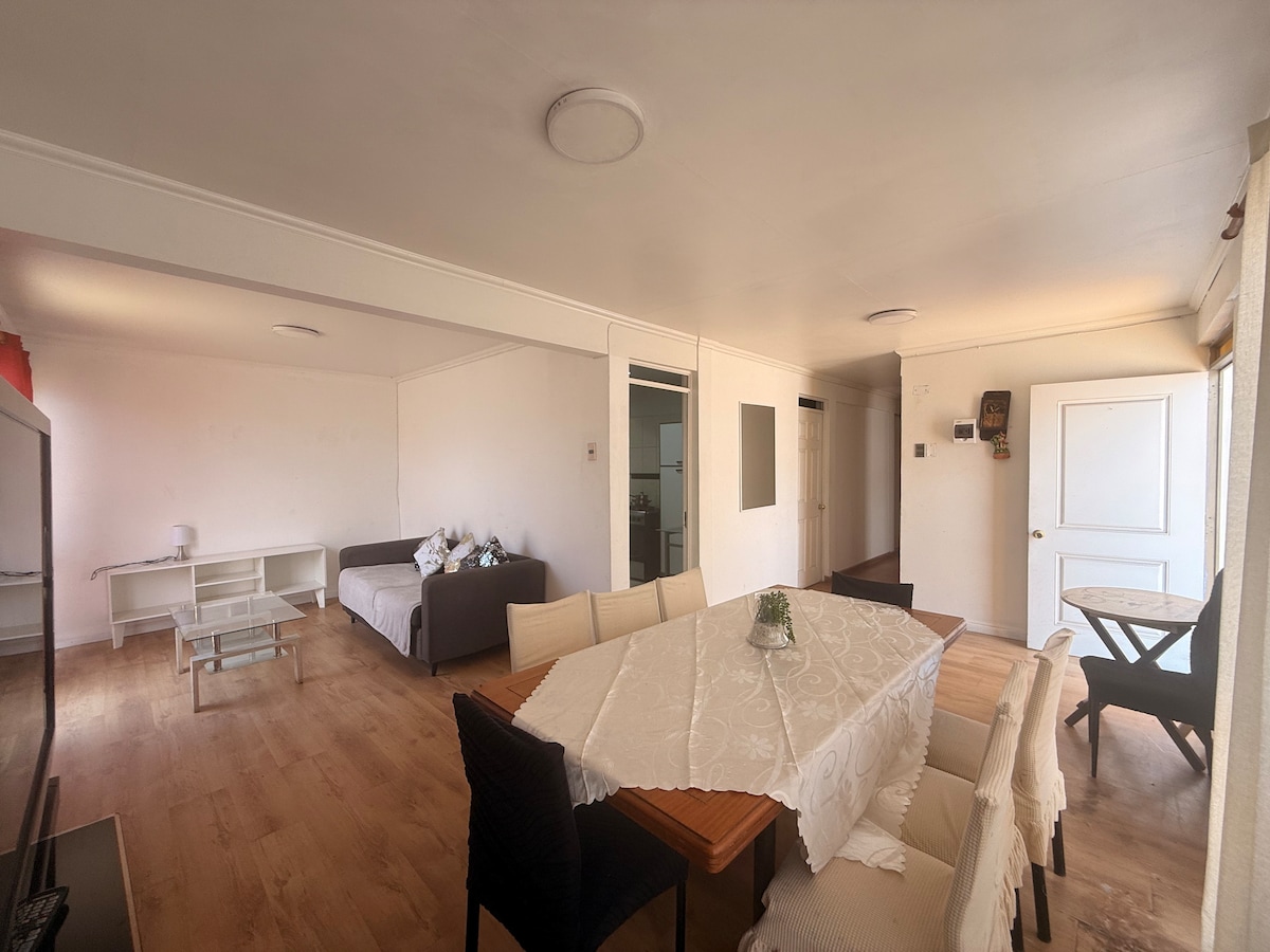Amplio departamento remodelado completamente. A pasos del centro, mall casino Luckya y boulevard de comida internacional. Ubicado en un condominio cerrado con 3 accesos uno de los cuales con tan solo 8 escalones . Con áreas verdes y grato ambiente familiar. Está equipado con living dos comedores para 4 personas cada uno, una terraza interior con una privilegiada ventilación y vista al casino. Un espacio que invita a la relajación y descanzo. host speaks fluent english.