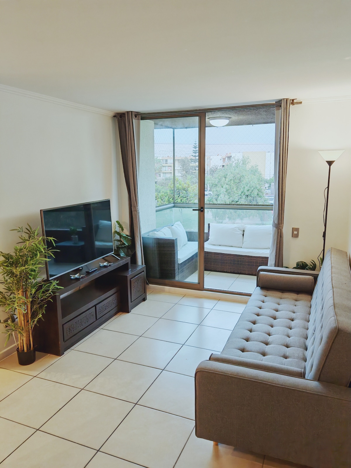 Departamento en Condominio seguro al lado de la playa. TV en living y pieza principal. Acceso a estacionamiento, internet, cable. Se entrega control portón automático. Departamento nuevo y remodelado. Posee lavadora y se entrega una toalla, elementos de limpieza e insumos básicos como te, café, azúcar. Secador pelo y Plancha. Cocina americana equipada. Al frente hay una Farmacia y minimarket y feria a 50 mts. Tenemos servicio de traslado aeropuerto. TNT Sport HD.