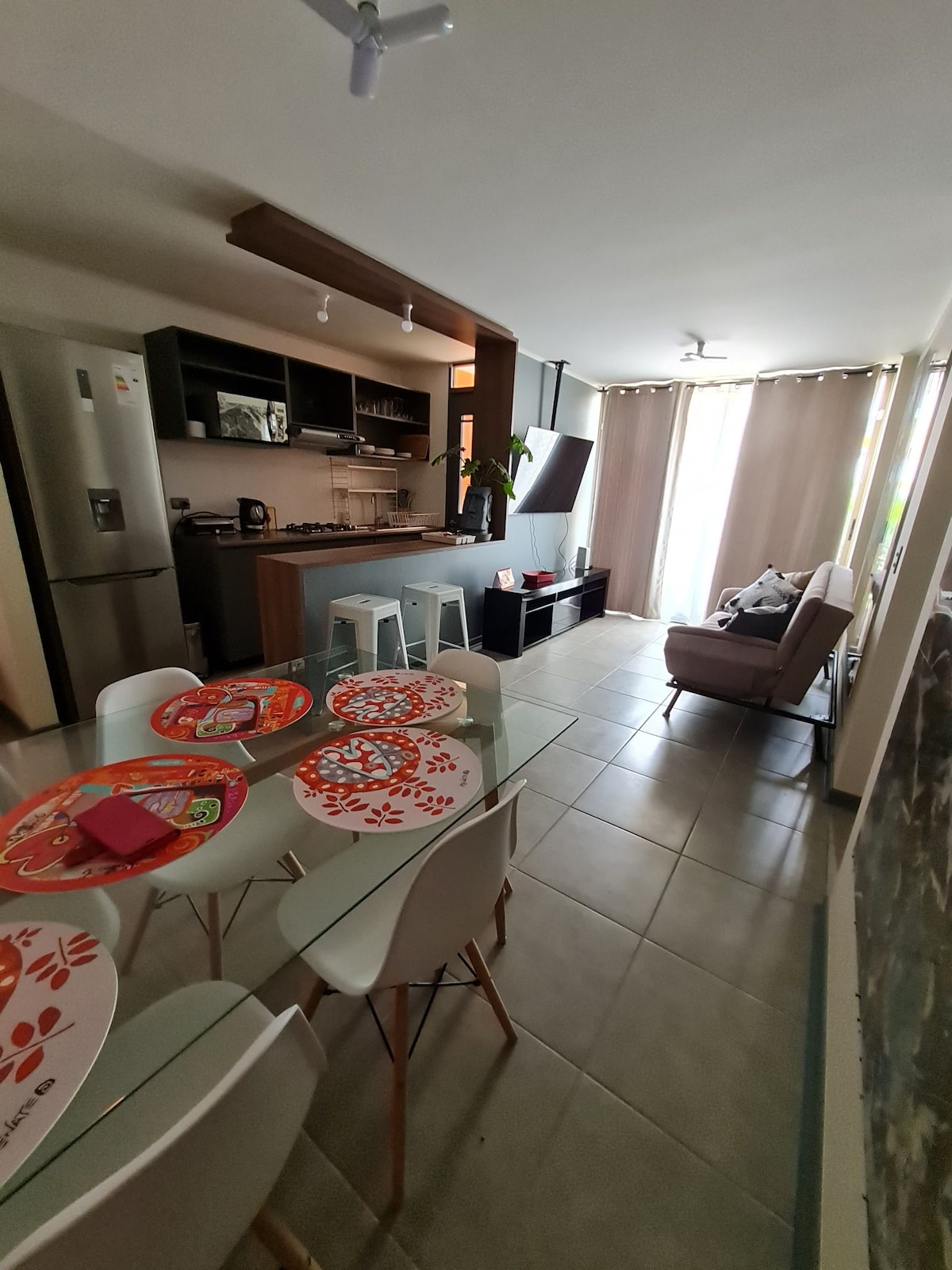 Amplio departamento remodelado completamente. A pasos del centro, mall casino Luckya y boulevard de comida internacional. Ubicado en un condominio cerrado con 3 accesos uno de los cuales con tan solo 8 escalones . Con áreas verdes y grato ambiente familiar. Está equipado con living dos comedores para 4 personas cada uno, una terraza interior con una privilegiada ventilación y vista al casino. Un espacio que invita a la relajación y descanzo. host speaks fluent english.