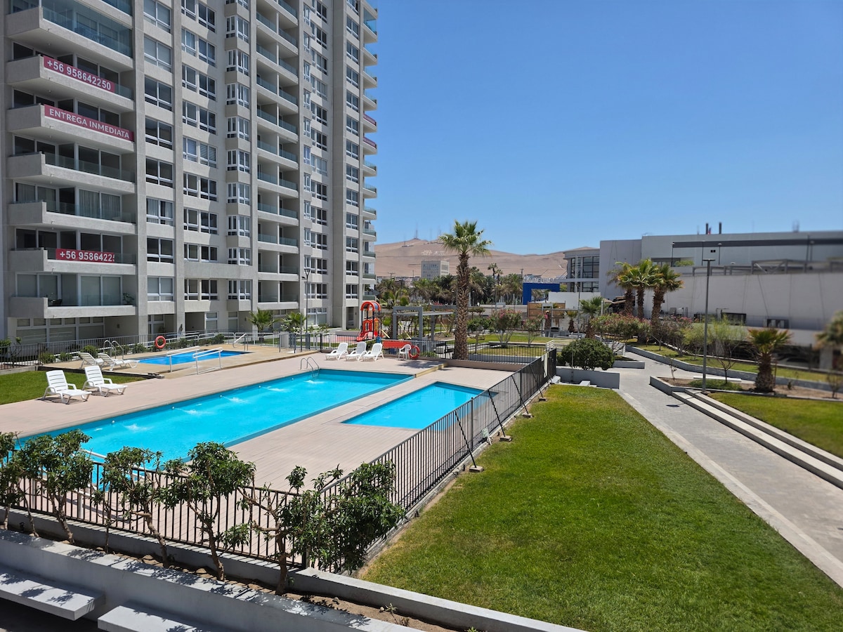 Hermoso departamento nuevo en condominio cerca de la playa, primer piso, estacionamiento, cuenta con piscina, quincho, juegos para niños, áreas verdes, vigilancia las 24 hrs. locomoción cerca.