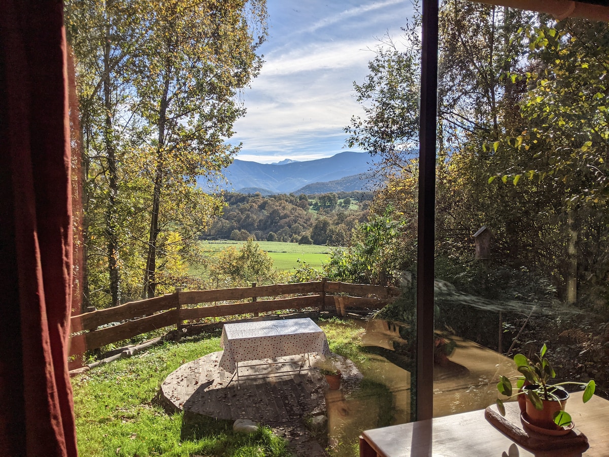 Posée sous les arbres avec vue sur les Pyrénées, la Pibounid est un point d'observation remarquables sur les paysages et la nature environnante. Bâtie en ossature bois sur une base de remorque agricole, c'est une véritable petite maison. Particulièrement bien isolée (laine de bois et ouate de cellulose) et équipée d'un poêle à bois, elle est habitable en toute saison et vous offrira l'hiver des perspectives magnifiques sur les montagnes enneigées.