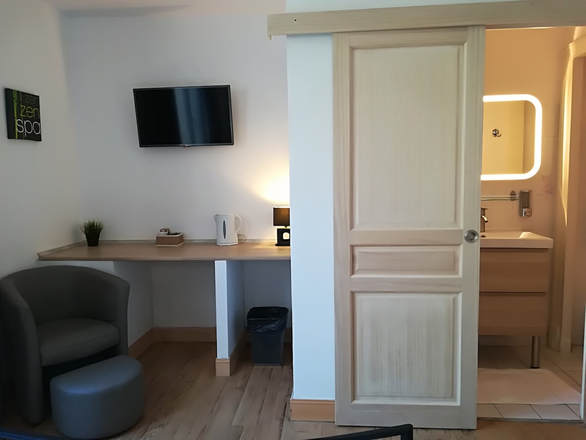 Vous adorerez le décor cosy de cette chambre privée avec salle de bains et WC L'accès est indépendant au gîte principal classé 4 étoiles, vous profiterez de piscine et terrasse partagée avec le gîte, équipée de bains de soleil et d'une plancha. Votre chambre équipée, d'une TV, d'un petit frigo, micro onde, machine à café et bouilloire. Un parking est à votre disposition avec de recharge électrique pour les voitures (avec contribution volontaire). Les draps de lit et serviettes sont fournis.