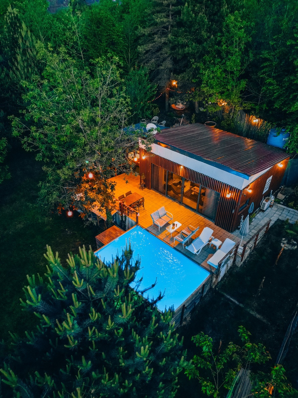 Tinyhouse muz 2 dön0m bahçesi olan 2+1 toplam beş kişi kapasiteli tüm odalar klimalı, salonda tv, netflix,wifi, şömine soba ve klimalı, mutfak beş kişilik eşyalı, bahçede 3x5 havuz, jakuzi, barbekü,ateş çukuru, hamak, salıncak, bahçe oturma gurubu ve bahçe masa sandalye bulunmaktadır. Çok geniş bahçe alanı mevcuttur. Tüm bu hizmet O gün rezerve yapan kişiye aittir ortak alan değildir.Bu rahat konaklama yerinde harika zaman geçireceksiniz.