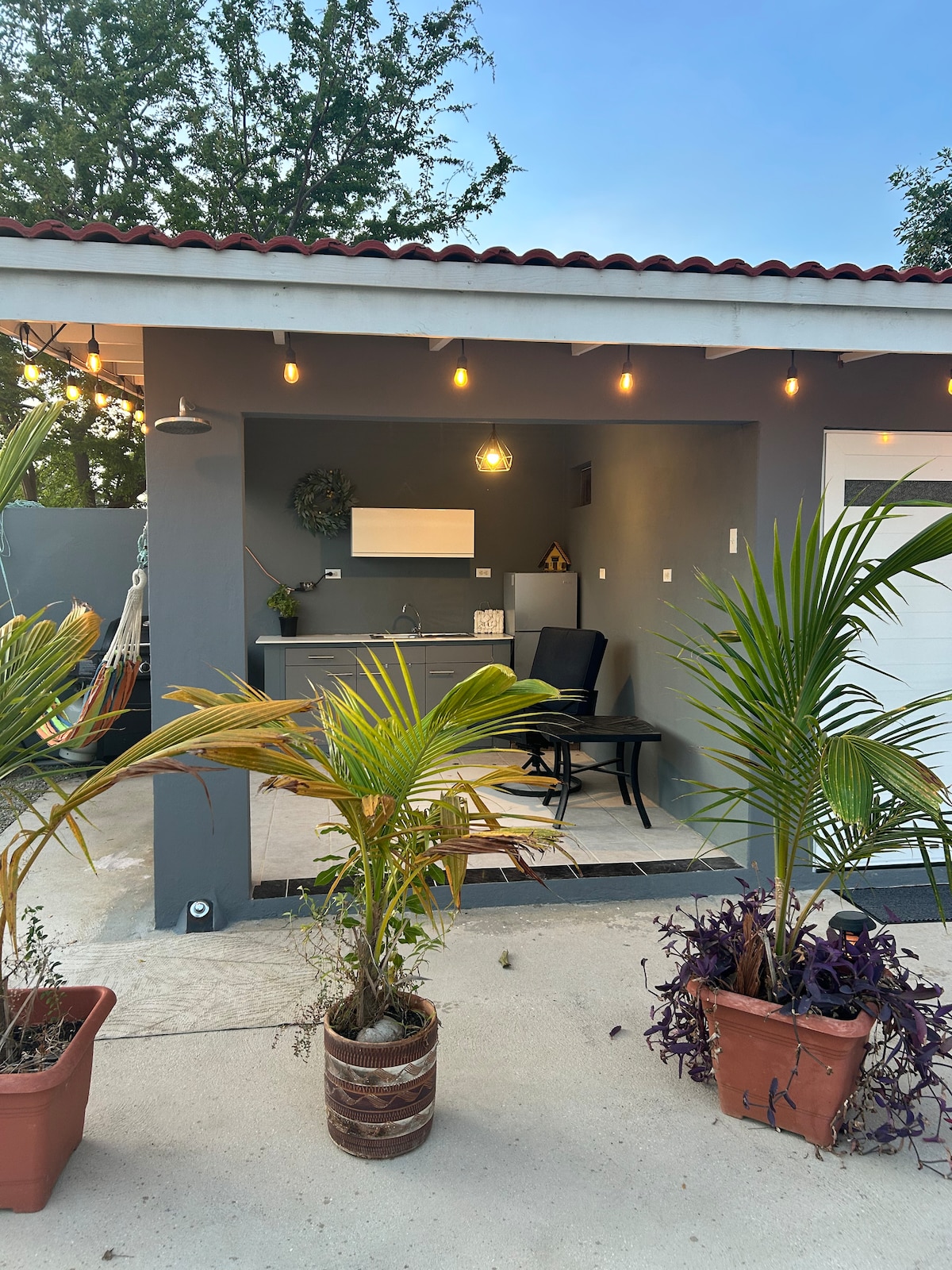 Located a stone throw away from the Spanish lagoon blue waters, your one bedroom appartment awaits you. We offer a secluded and private area where under the large gazebo, covered with palm leaves, you can enjoy hammocks, a dining and lounge area.