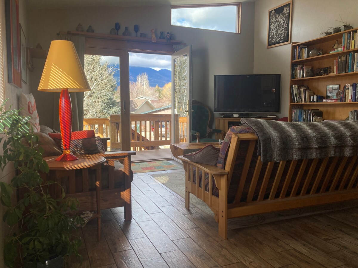 Our home is at the foot of the San Francisco peaks (Cheshire subdivision) and guests have the SECOND floor (includes 1 bedroom). A separate entrance off the second floor deck leads to the cozy penthouse with cathedral ceilings, views of the San Fran peaks off the balcony & bedroom, a full private bathroom, a kitchenette, and a tv/living room (w/futon) -- perfect for your get-away! Second floor accommodations are good for couples, solo adventurers, families (with kids).