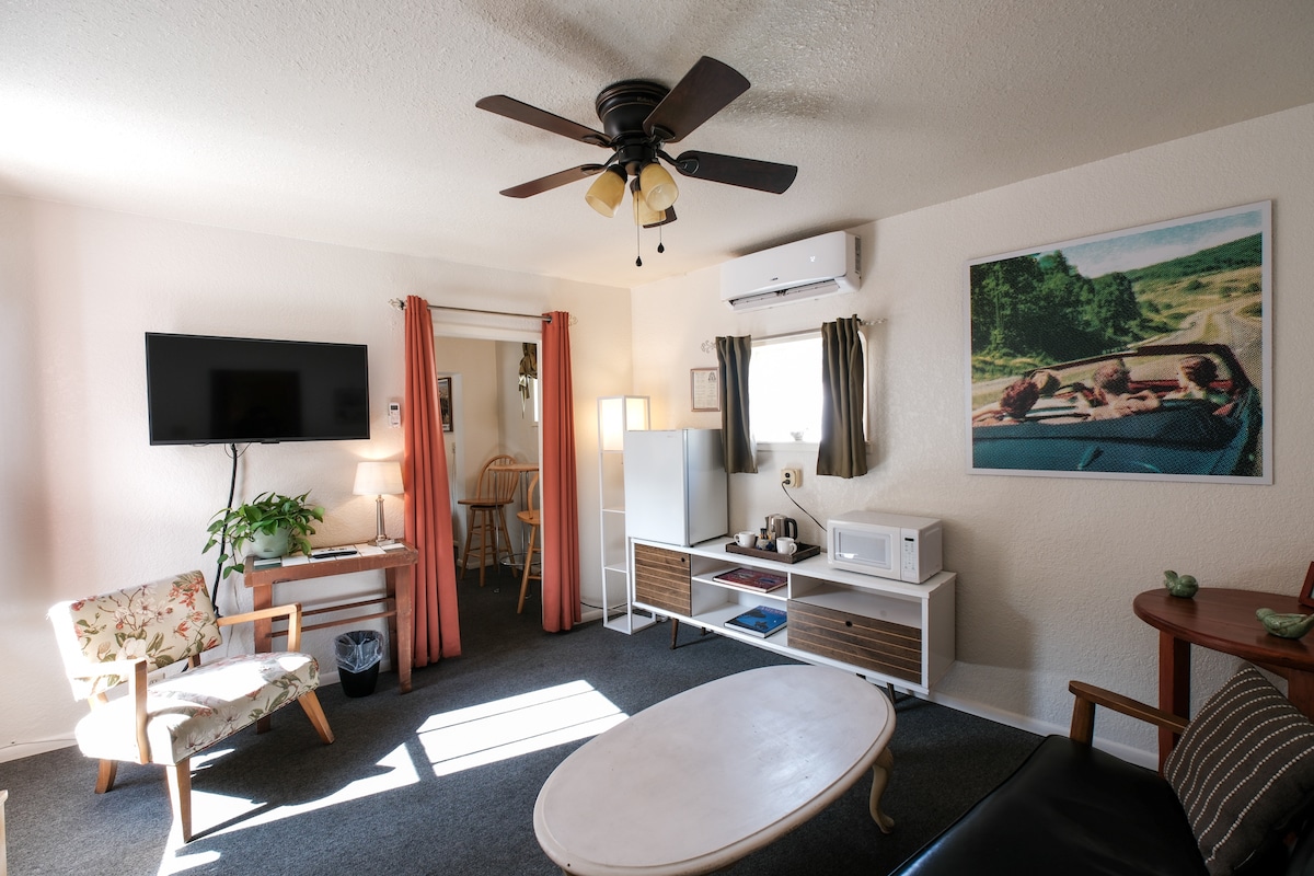 We are a Historic Motel built around in 1961. Situated right in the middle of Uptown (which is downtown in Sedona parlance). Direct views of the red rocks and Cathedral Rock right out your window, several great restaurants and bars within a few hundred feet walking (The Cowboy Club, Elote, etc), free parking in front, mellow vibe, clean rooms adorned with local Art, reasonable prices. Easy, comfortable and convivial. The perfect centrally located spot!