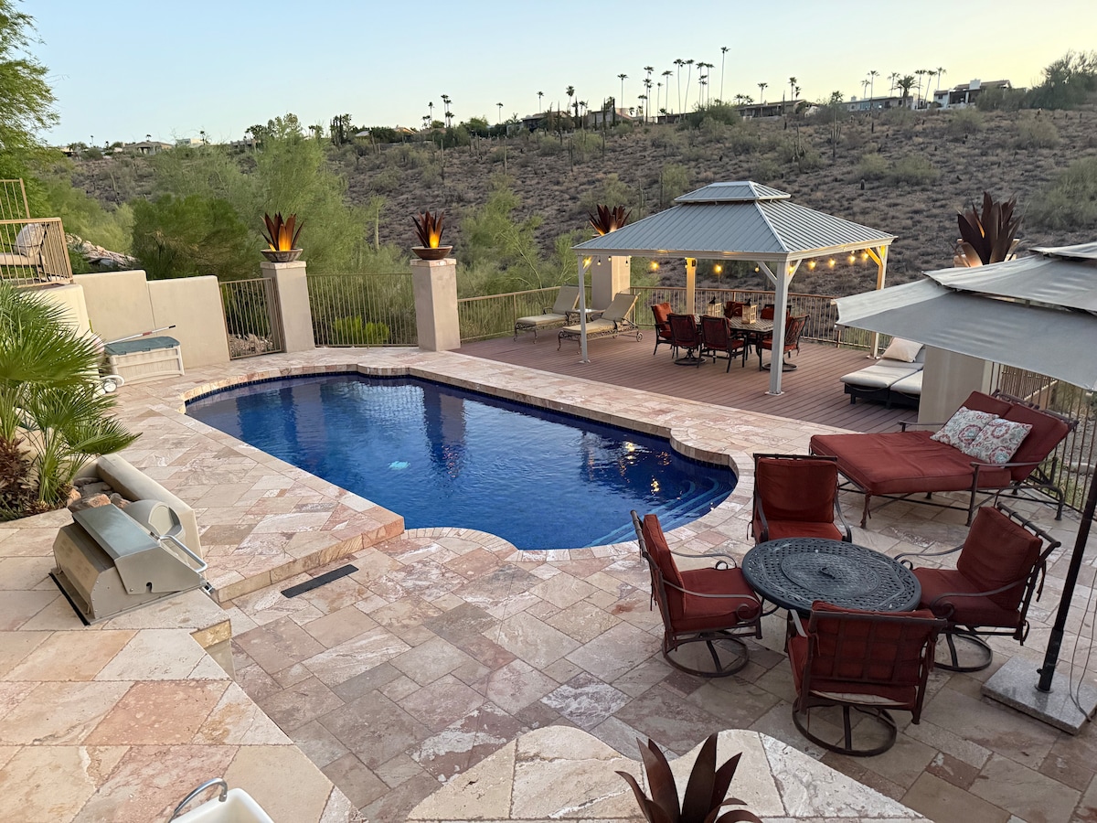 Welcome to The Callahan, a resort-style private retreat in a sought-after neighborhood near top dining, shopping, golf, and hiking. This spacious 5-bedroom, 3-bath home is perfect for families and groups, featuring a private pool, basketball court, putting green, home theater, gym, fire pit, ping pong, and pool table. Enjoy luxury indoor-outdoor living and unforgettable Arizona stays just minutes from the area’s best attractions.