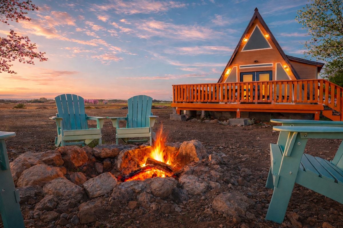 [Mandatory liability waiver signing upon arrival.] This 8-acre haven is not suitable for children under 18 due to the natural terrain, river access, and steep cliffs. NO DOGS (ADA only) Eagle Eye is a cedar sauna converted into a suite, perched atop a limestone cliff overlooking the enchanting creek, offering a unique and immersive experience like no other. With its concave window framing sunrise vistas, guests are treated to a cozy front-row seat to nature's spectacle.. Eagle Eye. 🦅👁️