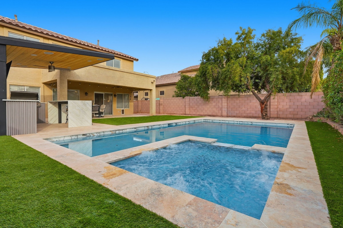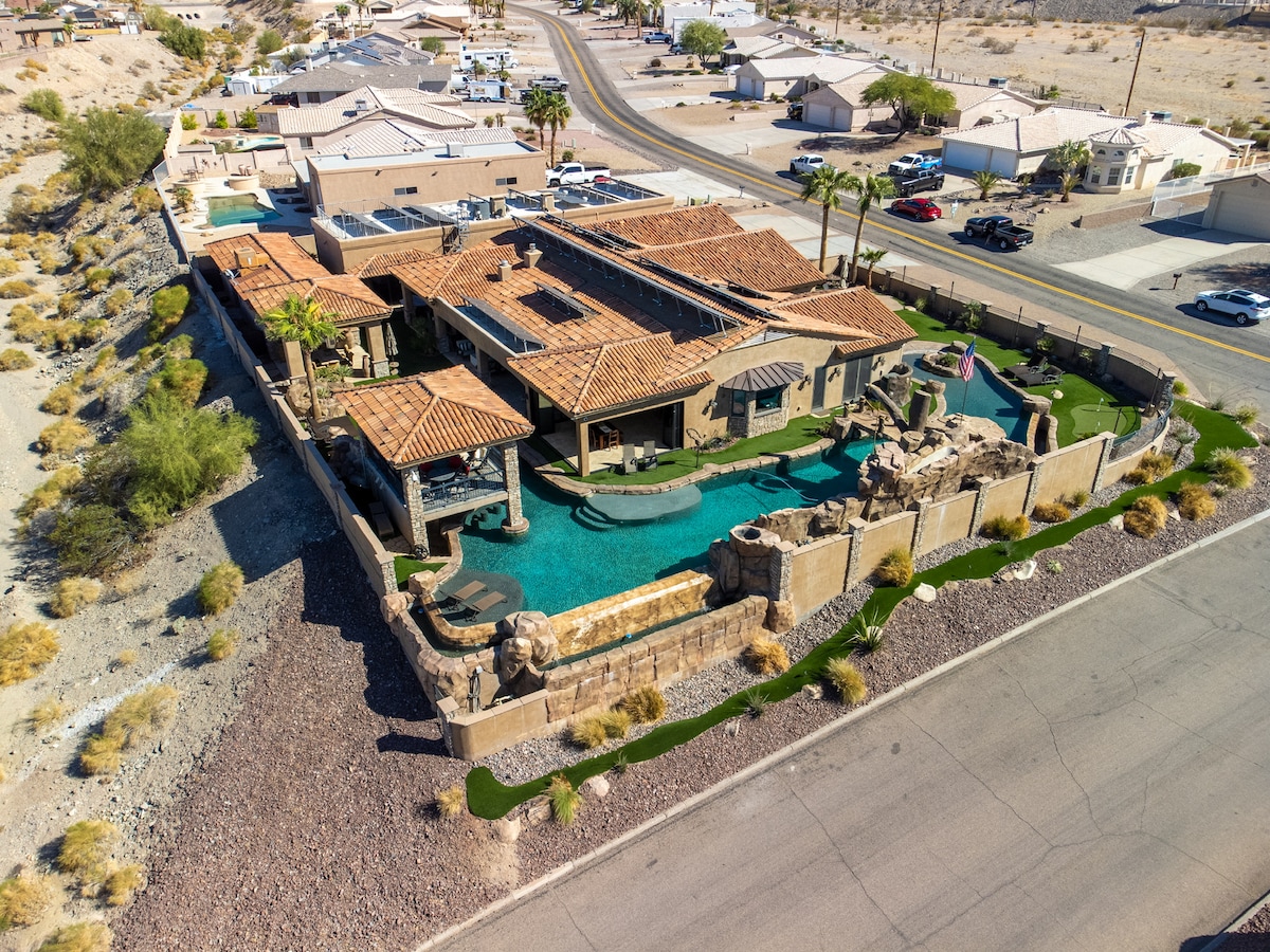 ⭐️ 3000 sq ft w/ luxury design and decor ⭐️ Mins to Riviera Marina and Downtown ⭐️ King Size Beds ⭐️ Hammock, games & putting green ⭐️ Golf Course and Mountain View’s ⭐️ Located on second green Our fully renovated Indoor-outdoor vacation home is a true experience in Lake Havasu City Nearly 3000 square feet and room for 14 guests, The Clubhouse looks like a 5-star resort, and feels like a home crafted with love. Amenities include a pool, hot tub, hammock, putting green & fire pit.
