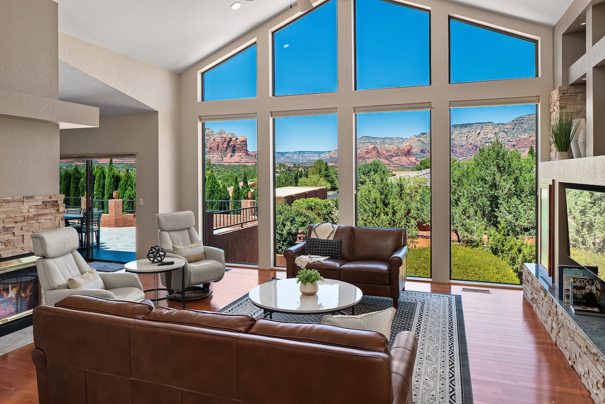 This LARGE (+4,300 sq ft) Home offers some of the most Breathtaking & Expansive 180 Degree Views of the Red Rocks in all of Sedona (which is what we all come here for, right?) And this is because this two-story home is perched upon a hilltop and borders MILES and MILES of National Forrest (very private!) On both levels of the home, you’ll have more deck space for entertaining and relaxing than you’ll know what to do with! And yes! Fire Pit and BBQ included for your use!
