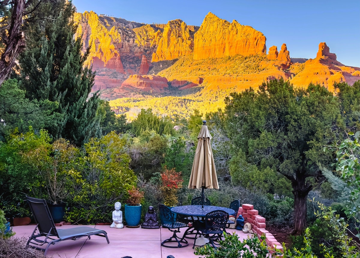 Are you coming for the VIEWS? ALL photos are taken ON the property! This feel-good home is a rare jewel even among the gems of Sedona. Coveted location close to Uptown amenities and awesome trails. Pristine red rock views and an inspiring ambiance that is conducive to renewal and re-connection. Fabulous sunrises and sunsets! This is the master suite with a PRIVATE ENTRANCE, deck, and shared patio. Enjoy some of Sedona's best scenery. Lovely and quiet; nearby houses go for up to $1200/nt.