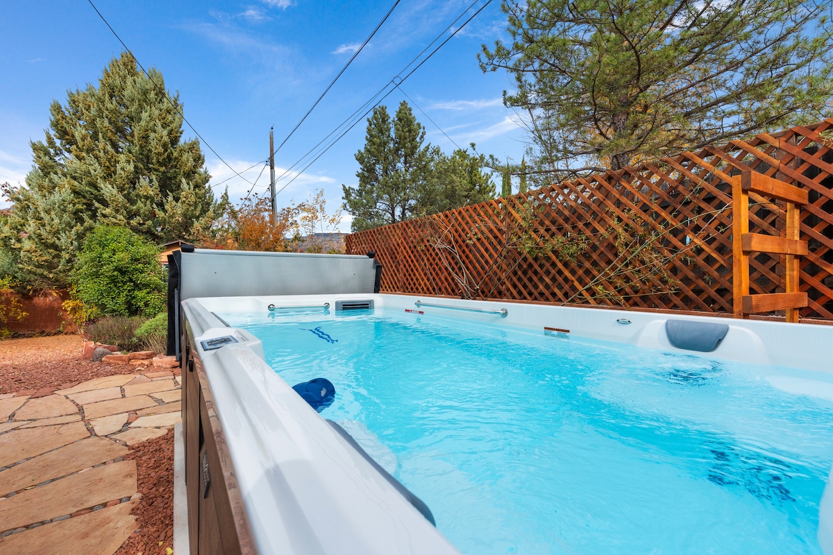 This exquisite three-bedroom, two-bathroom residence is the perfect destination for a Sedona retreat, whether you're planning a getaway with friends, a romantic escape, a business trip, or anything in between. Hummingbird's Heaven offers all the comforts and relaxation you desire indoors, while the outdoor area features a sauna, outdoor shower, and large swim spa/hot tub with an endless swim current. All of this can be enjoyed against the stunning backdrop of Sedona's iconic red rock formations.