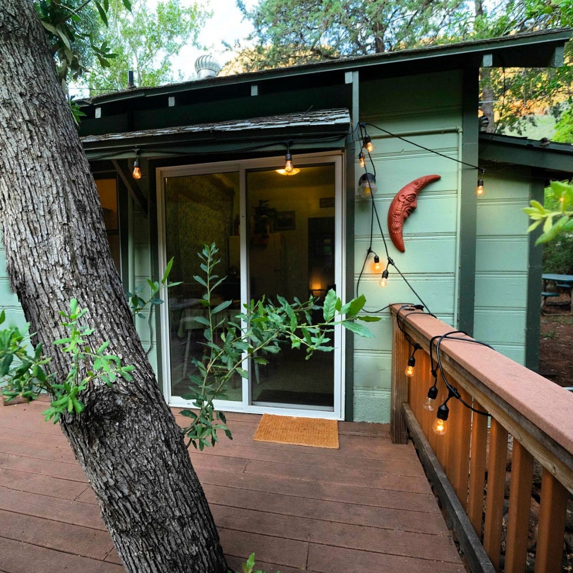 A tranquil, simple, historical cabin in Oak Creek Canyon, near Indian Gardens Cafe. Located on the backside of a 1950's trailer park, our space is vintage, eclectic, and fun-built in the 30s by my great-grandpa. 100 yards from the water, our lovely wooden deck- is surrounded by trees, birds singing and good energy. No Sedona fakery! Only good vibes. Hear the creek, swim, hike and enjoy provided morning coffee and amenities. If you love nature and camping this place is for you.