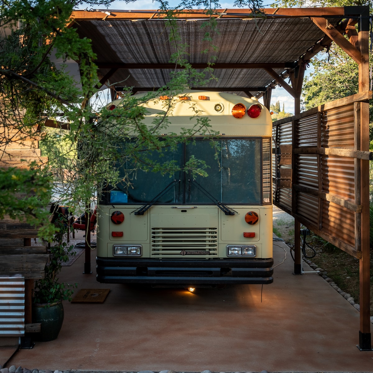 Come enjoy this charming rustic bus experience directly next door to Life Under The Oaks Lavender Farm. Has private outdoor kitchen and fantastic outdoor shower surrounded by trees. Enjoy private porch with beautiful rustic flare. You can cozy up with a fire in the magical yurt just steps away from the bus. We also provide two yoga mats in the yurt for your use as well. we have a yoga class every Tuesday and Thursday from 8:30am to 10am. you are welcome to join the class for free!