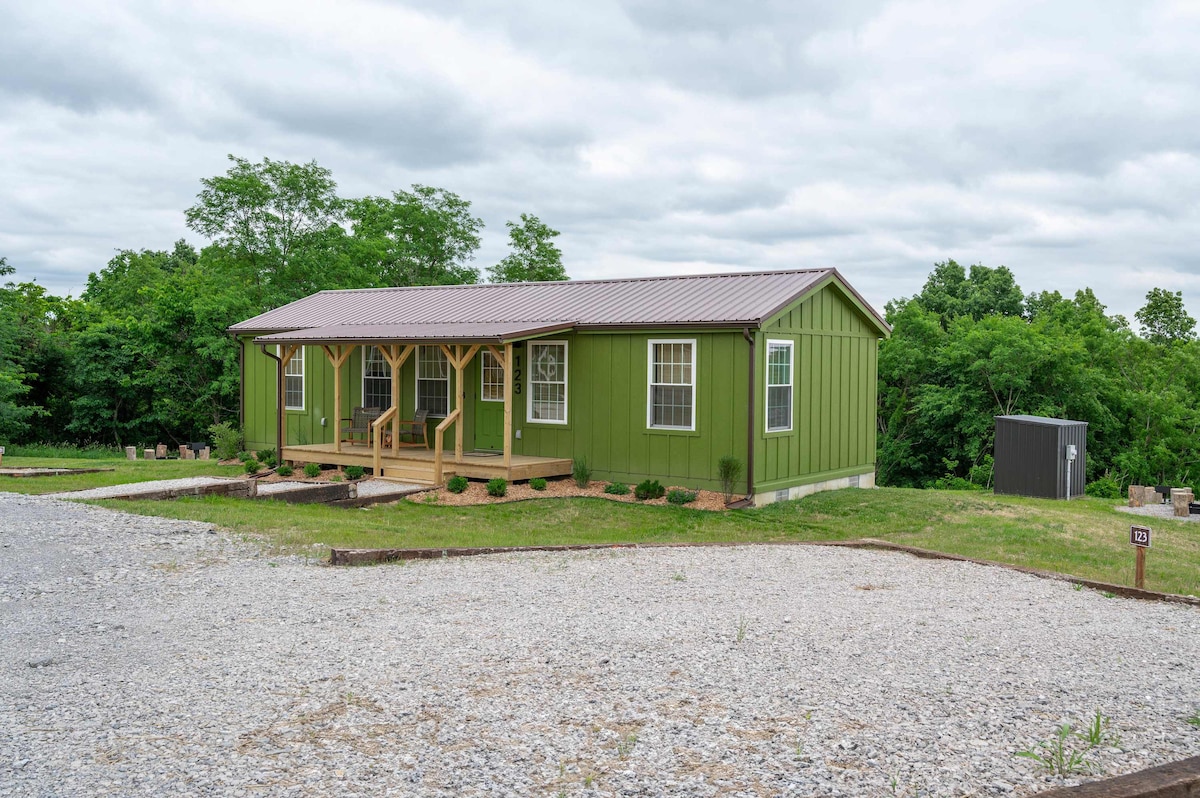Discover the charm of our rustic container cabin on a wooded ridge of our family farm. Freshly painted exterior—same comfy interior. 30 min to Ark Encounter. Unwind on the sunset porch under string lights, enjoy the fire pit & grill, and breathe crisp Kentucky air as you explore 200 acres of hills and trails. Inside: vintage farm touches, comfy memory-foam bed(s), efficient kitchenette, heat/AC, and a one-of-a-kind bath. A peaceful base for the Ark and Boutbon Trail. A true Kentucky farm stay.