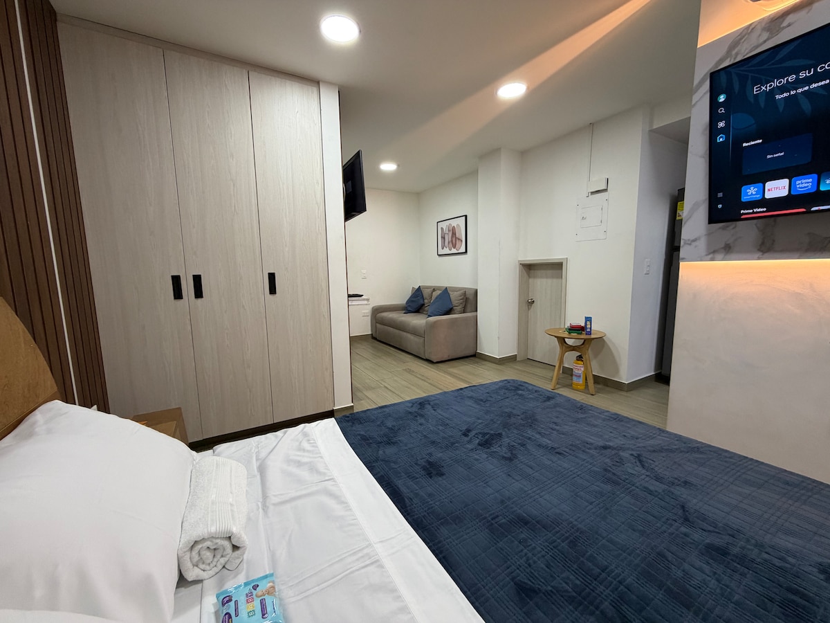 Suite completamente amoblada de 28 m2, con aire acondicionado y cocineta. Ubicada en una de las mejores zonas de Medellín, en un barrio muy tranquilo y cerca de todos los sitos de interés. La Suite cuenta con una vista espectacular a la ciudad y a las montañas. Podrás hacer uso de la zona de coworking, gimnasio y un espectacular café que ofrece diferentes tipos de bebidas a base del mejor café colombiano, podrás disfrutar de tu bebida en la terraza que se encuentran en el 2do piso del edificio.