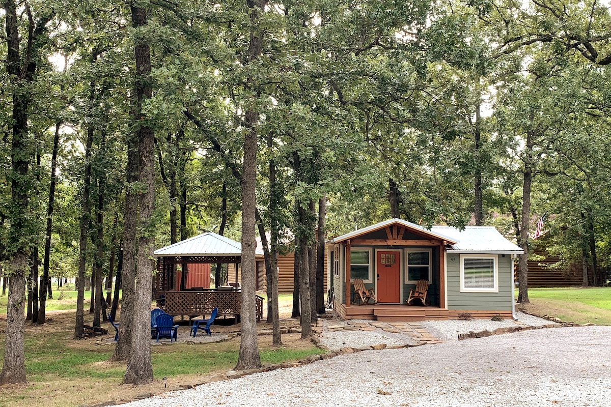 If you want a retreat where you can sleep in, slow down and savor nature's beauty, the Blue Door Cabin, tucked in surprisingly hilly oak and hickory woods, with a beautiful view of the pond, is your destination. Within two hours from Kansas City, Tulsa, Joplin or Wichita, and only 4 miles from Chanute Kansas, this preserved and revived cabin offers an easy getaway for city dwellers in need of a very affordable anniversary weekend, study or solitude retreat, or family hiking and fishing trip.