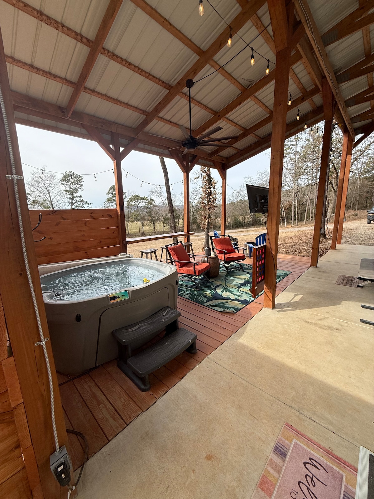 This 5 Star African Tent is in Hot Springs, Arkansas. Relax in a 7-person hot tub or use the heated outdoor shower on the deck. Inside the tent, enjoy your own TV viewing from bed. A stainless refrigerator with ice maker. Enjoy a wall oven and microwave drawer. Outdoor grill, wood burning pizza oven and fire pit. Private dock for fishing. Free Wi-Fi. The bathroom has a deep soaking tub with hand sprayer, and a heated bidet toilet. Come & experience The Covey of Hot Springs.