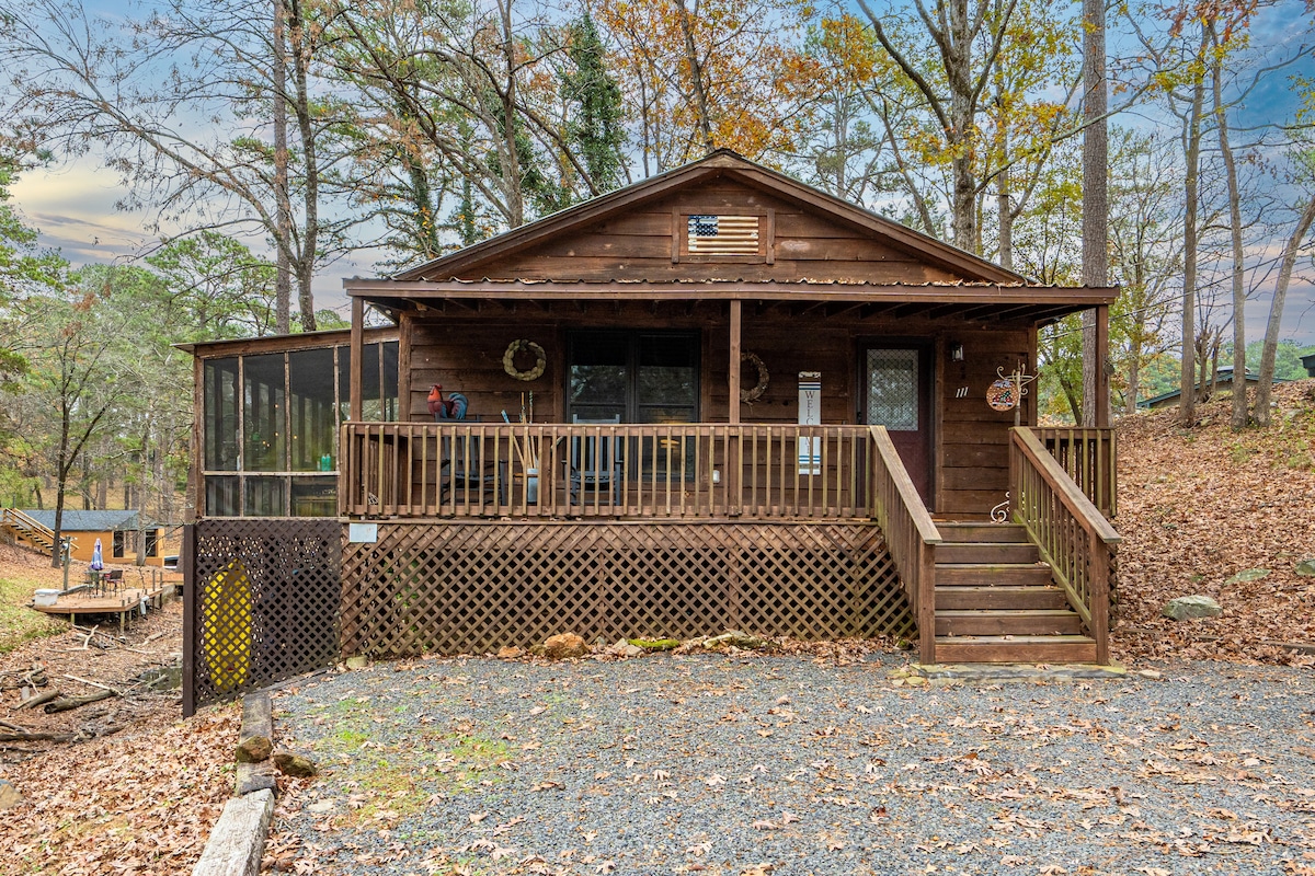 Nestled on 830 acres, but just a couple miles south of town, this completely renovated, historic cottage has all the modern amenities. It features an open floor plan that spans 40 feet from front to back upstairs, in one of the most peaceful and natural, tree top settings. It also has two covered/ screened in decks with a 16' bar perfect for enjoying the amazing scenery and the beauty of The Natural State. It's the perfect place for your next family gathering, or just to get away and relax.