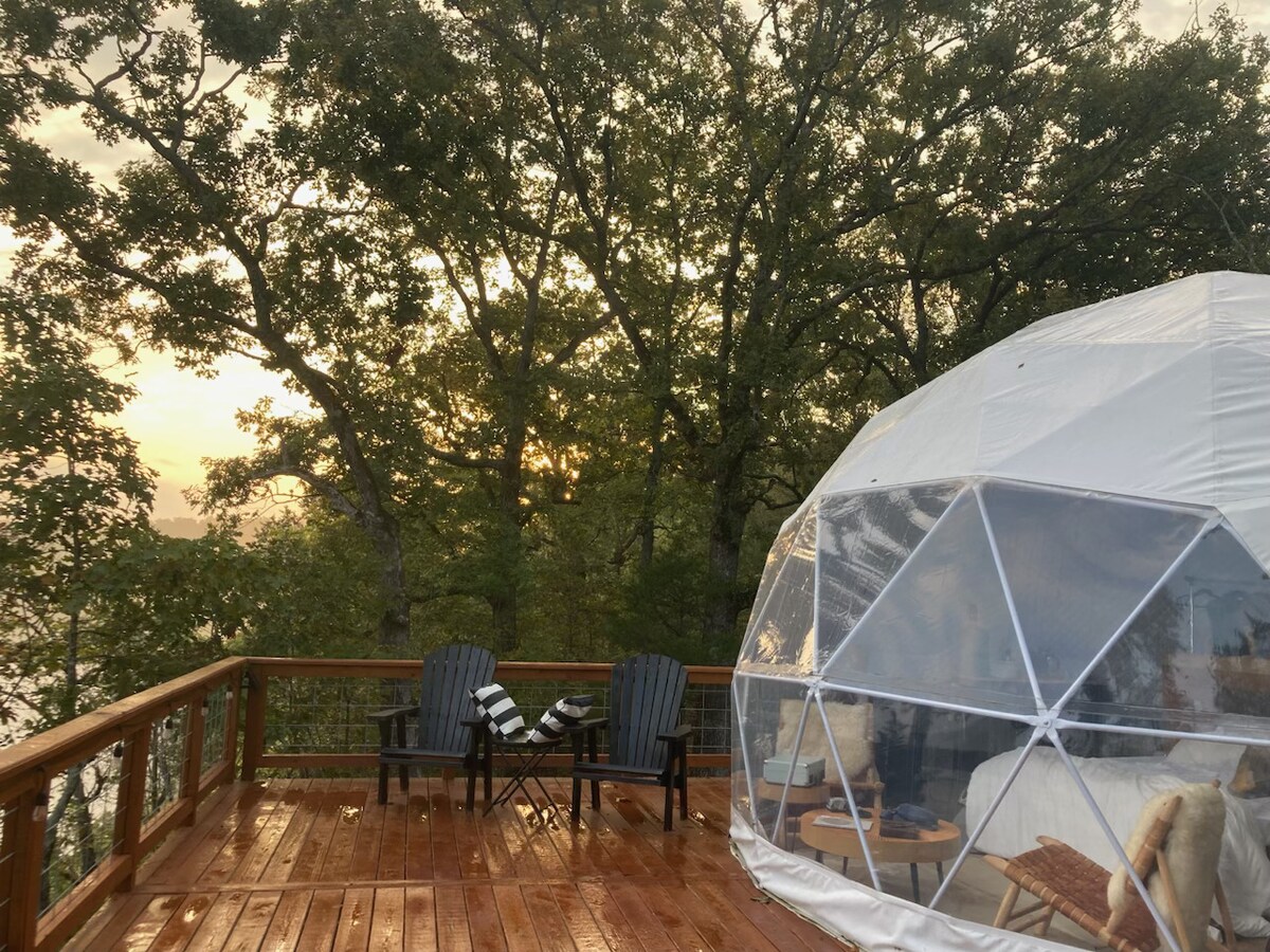 Adventure meets luxury with this one-of-a-kind glamping excursion, as seen on the cover of 417 Magazine! All the best of nature combined with the luxury of an upscale hotel room. Gaze up at the stars, or out at the rolling Eureka forestry from the comfort of your 100% climate-controlled dome. Enjoy the outdoor soaking tub. Cookout on the deck. Drink cocktails from the built-in hammock. 15min to Eureka Springs downtown. 8 min to Beaver Lake/Big Clifty swimming area.