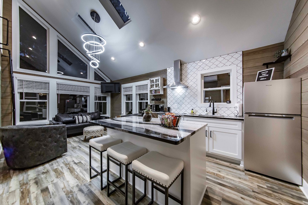 “Twisted Pines Luxury Escapes” is a Romantic treetop retreat with tranquil pond views and a glowing fountain,set on five private acres of pure privacy. Indulge in the deep soaking tub, enjoy heated towel rack, or unwind in the hot tub beneath a blanket of stars. Spend your days playing cornhole, ping pong, & paddling across the pond in a paddle boat provided , step into a full retro arcade tucked inside a classic Airstream camper.Nature,luxury, & endless fun combine for an unforgettable getaway