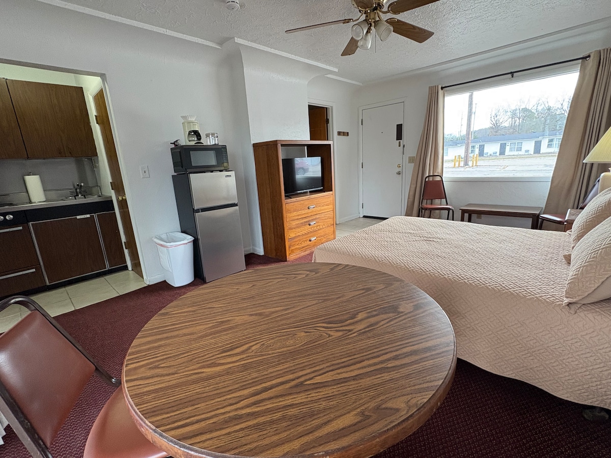 Enjoy a simple, comfortable stay in this hotel-style room with two cozy beds and a private exterior entry. Perfect for a quick getaway, fishing trip, or solo retreat, the room includes a full bathroom, coffee maker, and smart TV. Step outside to enjoy access to shared fire pits, grills, riverfront seating, a gym, sauna, and more—all just steps from the river. Clean, convenient, and peaceful—everything you need for a restful stay.