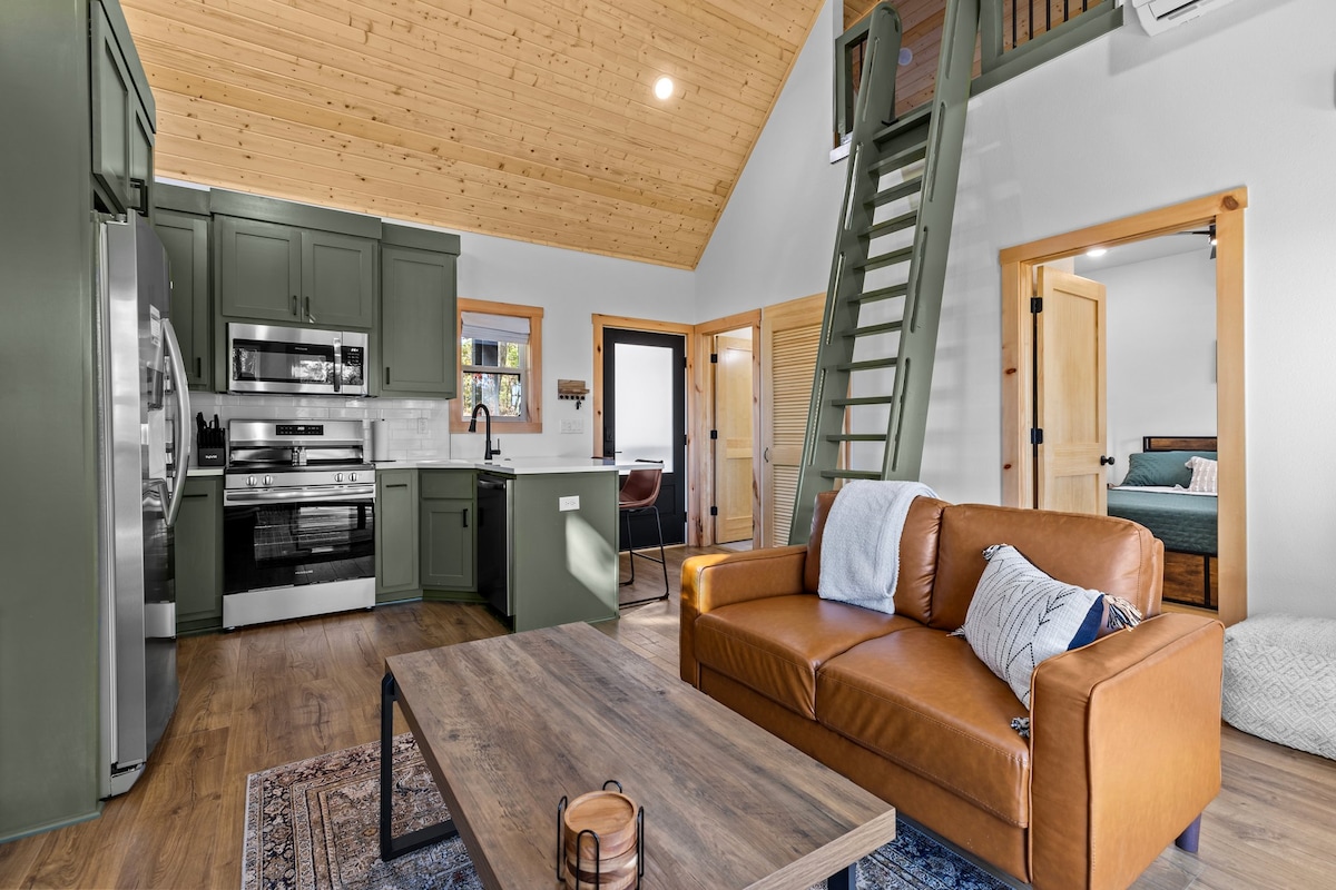 The Cuddly Cow features a full kitchen with laundry, eating bar and dining area. There is one large bedroom with a king size bed. The room has a slider out to the front with table and chairs to have a peaceful enjoyment of nature. Full size bathroom with shower over tub and dual sinks. There is a pool next to this cabin that is not useable for guests due to insurance limitations. We have 3 addt'l cabins on the property, Velvet Rooster, Happy Hound & Pampered Peacock.