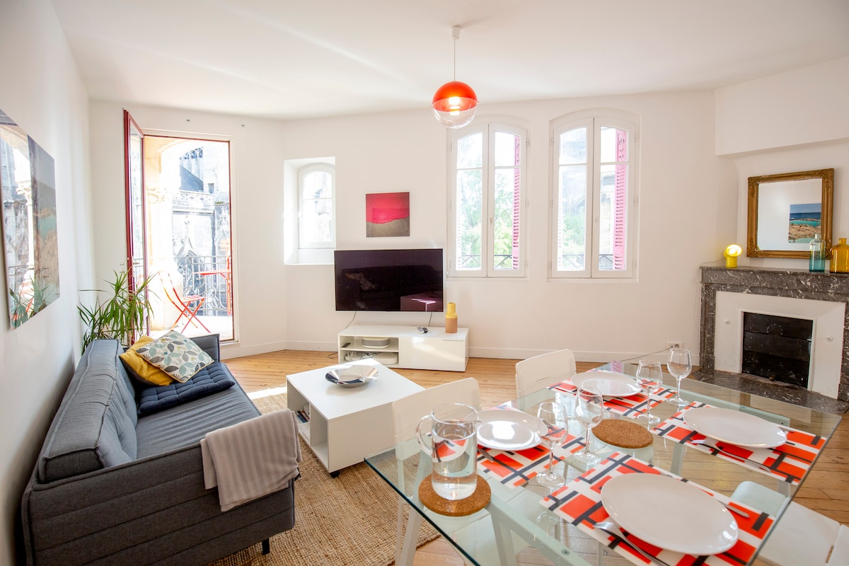 Apartment 85m2, Hyper centre, historic district. Spacious living room - 2 bedrooms One with a queen size bed transformable in 2 simple beds (80cm large) and the other one with a double bed (140cm)- Spacious kitchen - bathroom 2 sinks - separated toilets. Breathtaking view on the Place du Palais and Porte Caillhau. Elevator. Everything is just a stone's throw away! Docks, restaurants, terraces, shops, cultural. Garage (€20/day) only < 11:00am. No possibility to move the car during the stay !