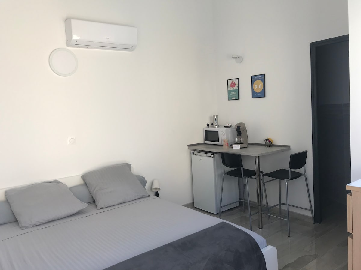Nous vous accueillerons dans une de nos 2 chambres neuves, climatisées et totalement indépendantes, situées à seulement 50 mètres de la plage et 100 mètres du port de plaisance. Chaque chambre dispose d’une TV, d'un réfrigérateur, d’un micro-ondes, d’une cafetière, ainsi que d’une salle d’eau privative avec douche et WC séparés. 🧺 Linge de maison fourni + options de lavage et autres prestations (petit dej) sur demande/disponibilité.