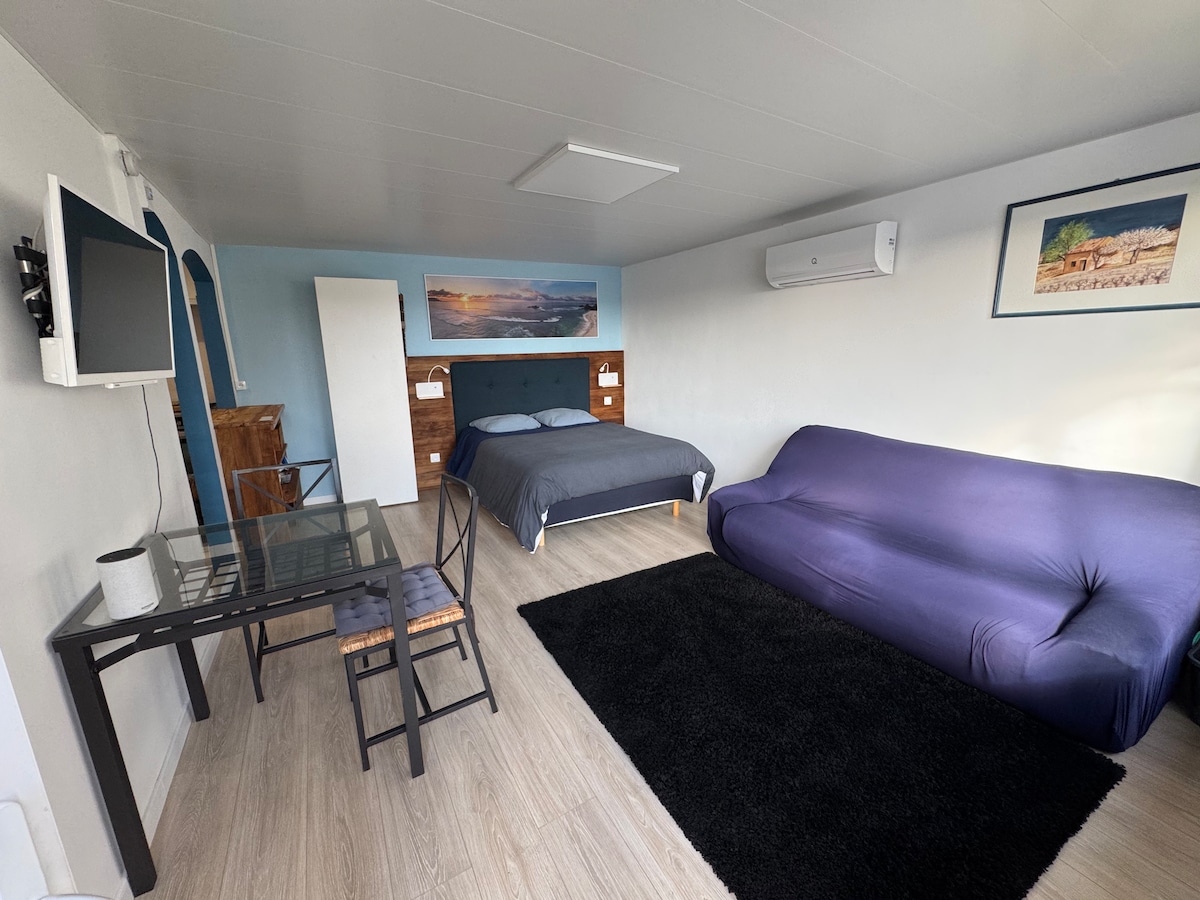Agréable et lumineux studio en rez de jardin, situé à proximité du centre ville. Pouvant accueillir trois personnes, ce logement est composé de son entrée privative, d'une chambre, d'une salle de bain et d'une pièce de vie avec couchage d'appoint type BZ. Il est équipé de tout le confort nécessaire; climatisation, lave vaisselle, lave linge, TV.... A l'extérieur, vous pourrez profiter d'un jardin privatif avec terrasse, d'un barbecue, table de ping-pong et bains de soleil. Parking sécurisé.