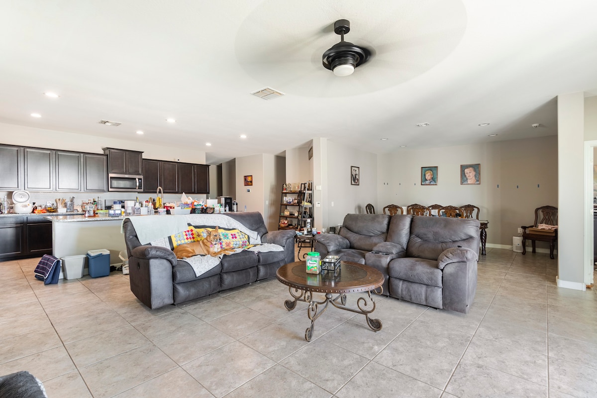 Newer open house, beautifully decorated ,4 bedrooms, 3 bathrooms, large open concept , 70" smart Tv, plus smart tvs in all rooms,optional heated pool, through Oct through May 31st, quiet neighborhood, tennis courts, ball fields, splash pad within walking distance. Heating of pool is AN ADDITIONAL $25.00 PER NIGHT. Please let us know. We charge 35.00 a night for guest 7 or 8. Please include ,guests staying the nights, ages of children and also if they know how to swim prior to approving.