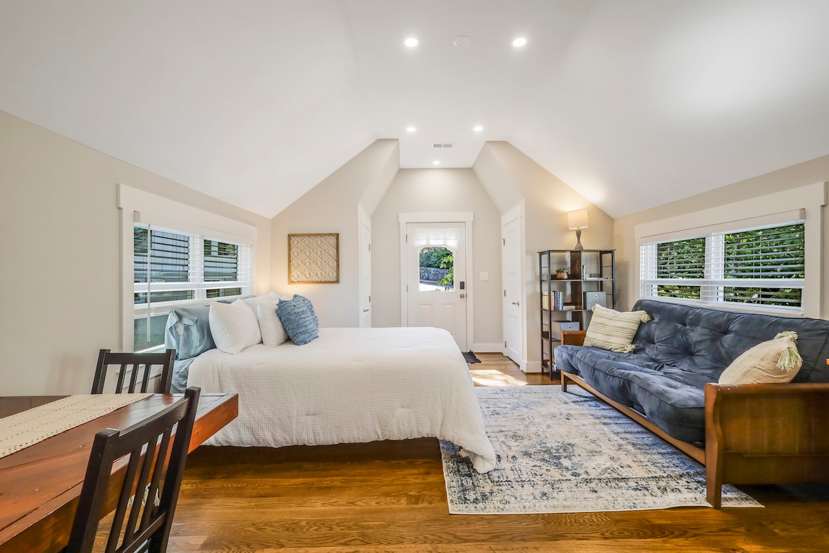 Art filled studio guest suite on quiet wooded lot. Minutes from DC yet feels amazingly private. Enter through charming tiled gate into private patio. Great sleep experience with hypo-allergic organic bedding. Perfect for romantic getaway or base for tourism. Bookshelves stacked with guidebooks and games. Off street parking. South Arlington known for diversity, ethnic restaurants and Amazon HQ2. Close to bus/metro and we comply with AirBnB's COVID-19 cleaning protocol.