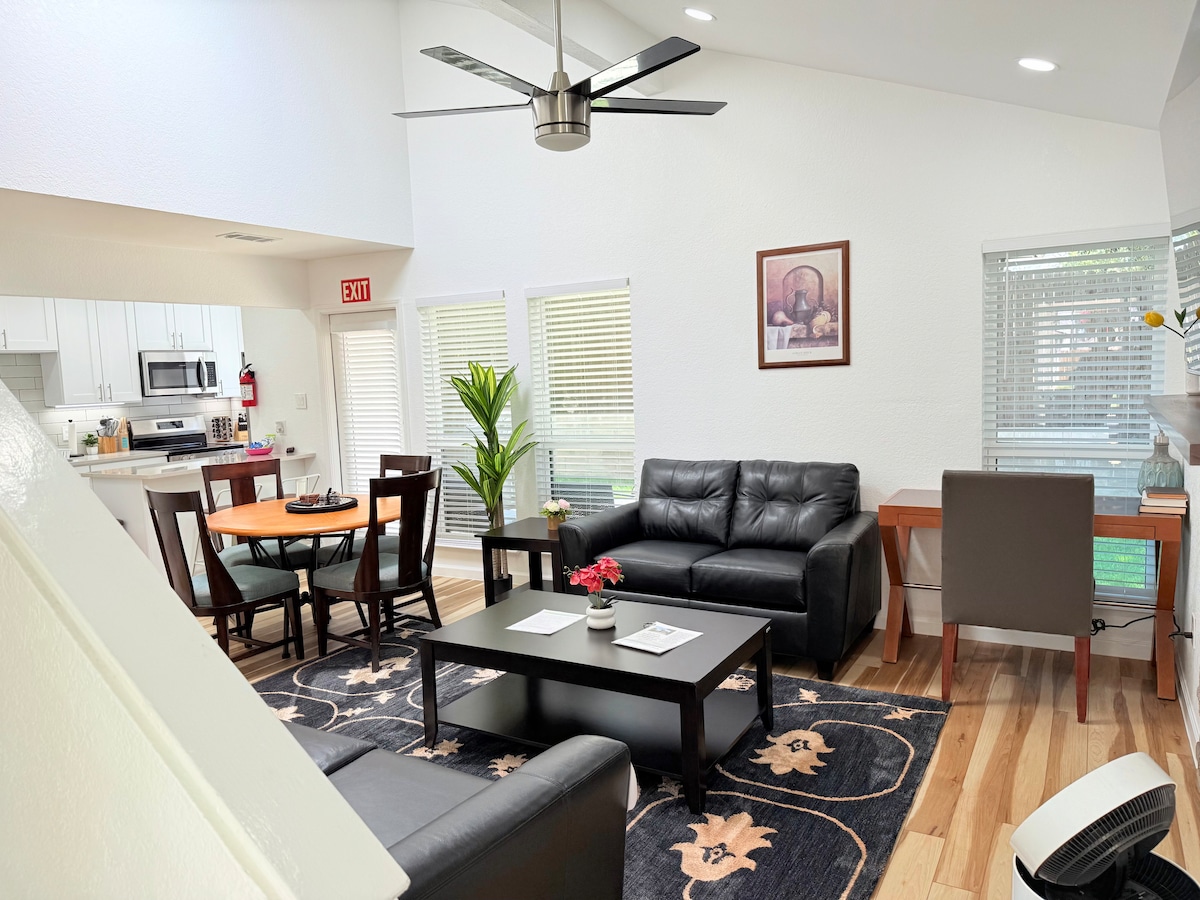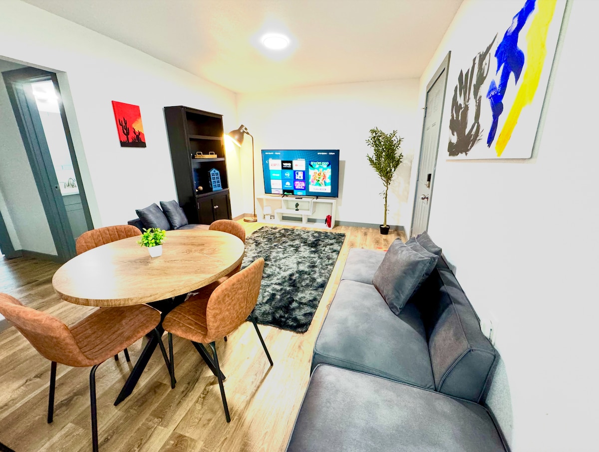 Step into classic Fort Worth with all the modern amenities you need! You get full access to everything Fort Worth has to offer in this centrally located spacious and cozy efficiency home. Whether you're here checking out the beautiful city of Fort Worth or here for business, you'll have everything you need. You'll enjoy a large open space with a king size bed, comfortable couch and chair, dedicated dining and work space, beautiful bathroom, and a full kitchen suite for all your cooking needs.