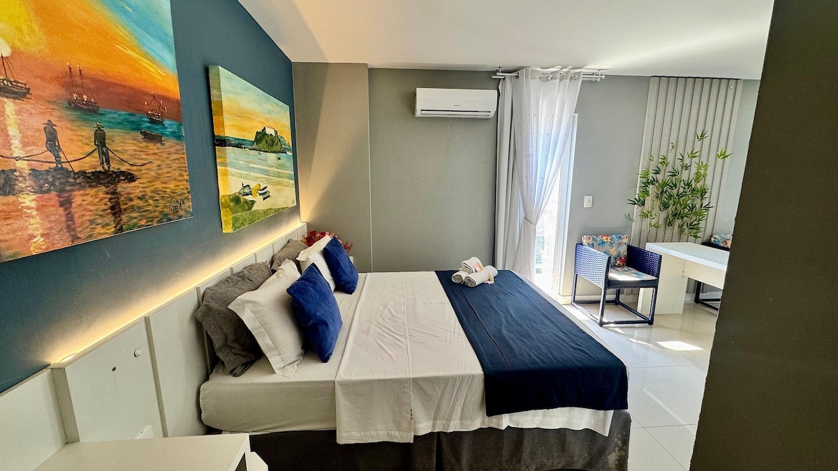 Descubra o conforto e a praticidade do Flat 209, localizado no charmoso Bairro da Passagem, em Cabo Frio. O flat acomoda até 4 pessoas e oferece: Cama queen confortável, sofá-cama para casal, ar-condicionado, micro-ondas, cafeteira elétrica, TV de 46", Wi-Fi gratuito para sua conveniência, mesa para notebook ideal para trabalho remoto e ferro de passar para sua praticidade. Roupa de cama e banho para até 04 pessoas.