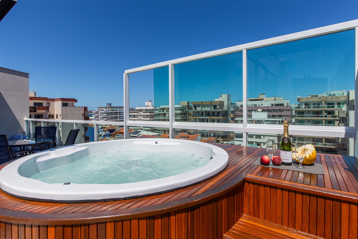 Você vai amar! Local estratégico. Avista parte da enseada, dunas, as montanhas de Arraial. Iluminado, ventilado, moderno, 92 m². Acomoda confortavelmente 5 pessoas, 1 cama queen e 1 solteiro no quarto e 1 cama de casal na sala. Conceito aberto na área social, sensação de bem estar em 3 amb climatizados, cozinha planejada . Varandão com sofá, mesa e churrasqueira. Amplo banheiro com banheira sem hidro. Banheiro auxiliar. WiFi, smart TV. Sol da manhã. Ideal família, 2 vagas.