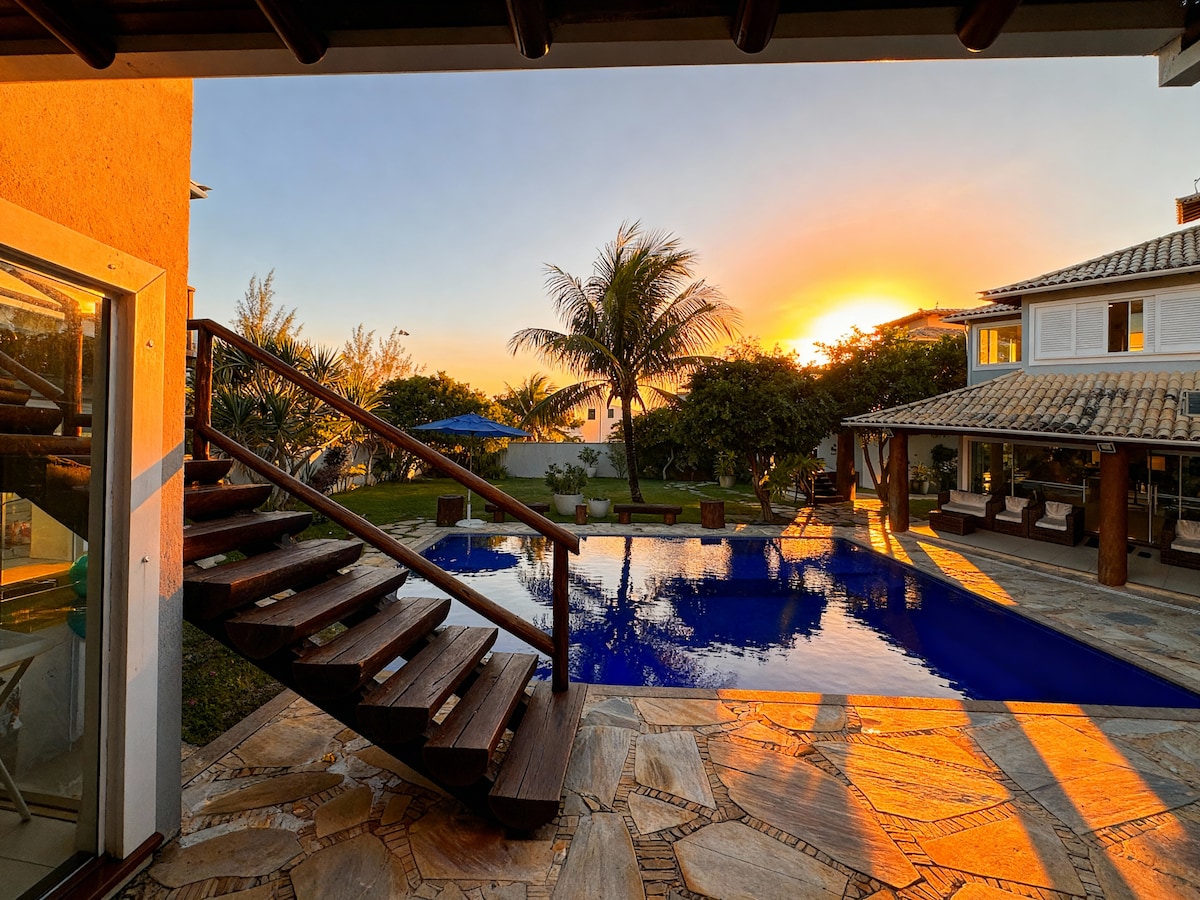 This elegant accommodation is perfect for family and friends traveling Home office with high-speed Wi-Fi House located in a gated community with 24-hour concierge A small private lagoon beach with the most beautiful sunset in the city Beautiful garden with shower, gourmet area with barbecue Very airy and inviting house with air conditioning in all rooms Pure energy. Easy access to the beaches of Cabo Frio, Arraial do Cabo and Buzios We are Pet Friendly
