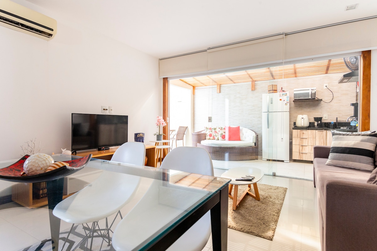 A casa acaba de passar por uma reforma na sala, cozinha e área externa. Ficando ainda mais aconchegante e bonita. Linda, nova, toda mobiliada e com todos os utensílios domésticos. Churrasqueira privativa e chuveirão na varanda . Muito perto e Fácil acesso a diversas praias. Ar Split na sala e nos 2 quartos. 5 min a pé da Rua das Pedras ( Deixe o seu carro na garagem e va a pé ) Condomínio fechado com garagem Porteiro e Segurança 24 horas. Cadeiras de praia e 🏖 Internet Wi-fi Disponível