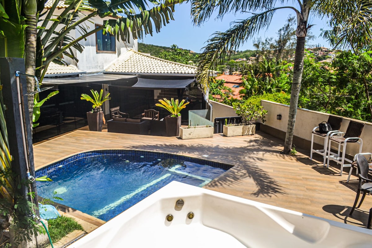 Casa de sonho com linda área social com piscina, sauna à vapor, terraço com linda vista e espaço agradável coberto com churrasqueira e lavabo. Com duas salas de estar, sala com TV de 70 pol., cozinha completa com sala de jantar, lavabo e quatro confortáveis suítes. A casa tem uma vista do mar fantástica! Perto de quatro praias e da Orla Bardot, que leva à pé à Rua das Pedras. Casa extremamente charmosa e sofisticada! Acomoda um máximo de oito adultos e quatro crianças (até 12 anos de idade).
