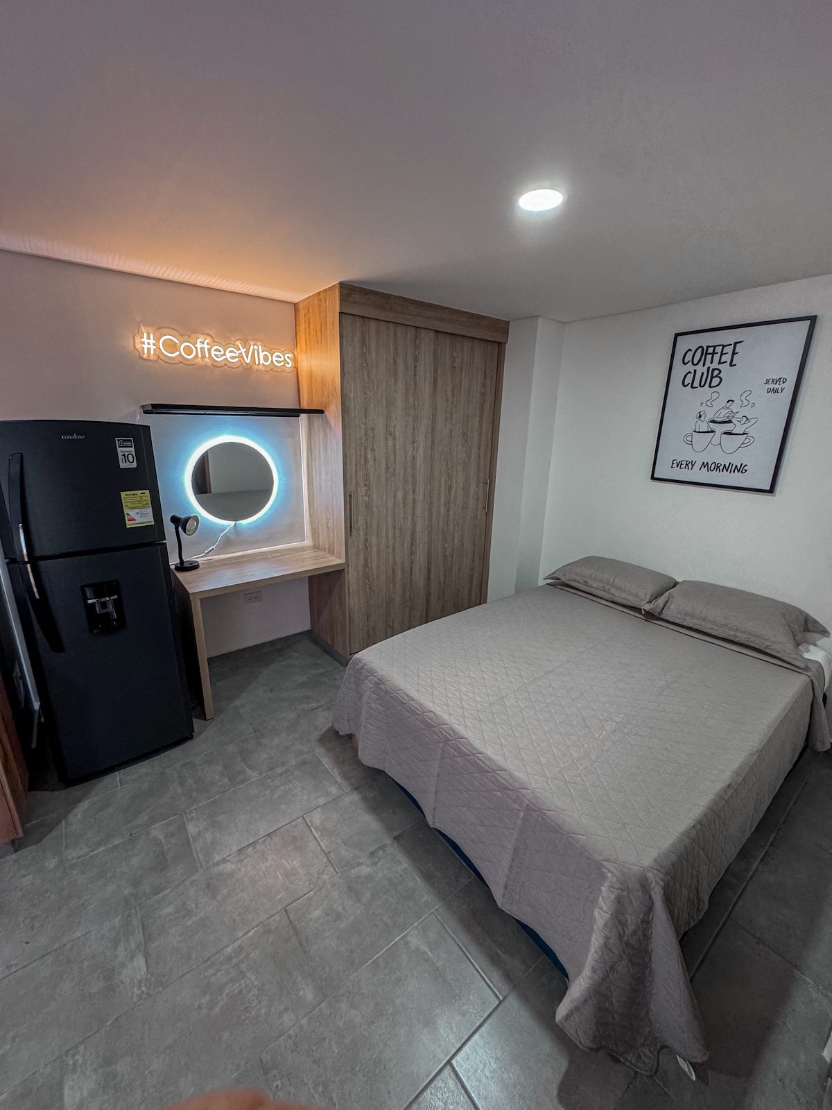 Disfruta un hermoso amanecer Quindiano en este acogedor alojamiento. Diseñado para una estadía inolvidable en el norte de Armenia, Quindío. Este lindo hospedaje ofrece todas las comodidades necesarias para sentirte como en casa. Ideal para parejas y ejecutivos, este edificio nuevo se destaca por su ubicación privilegiada, a tan solo unos pasos del Portal del Quindío, restaurantes, cafeterías, farmacias, supermercado y hospitales.